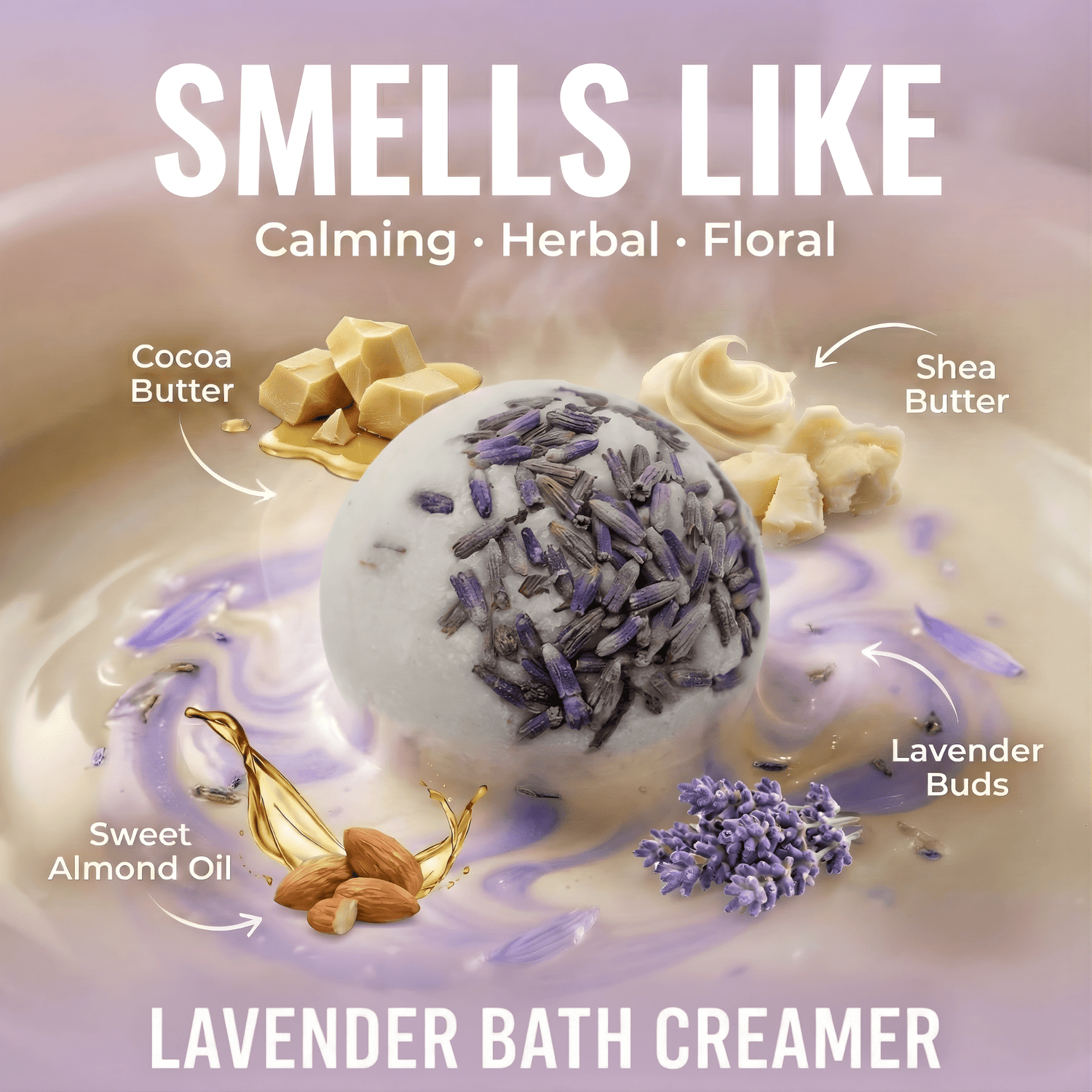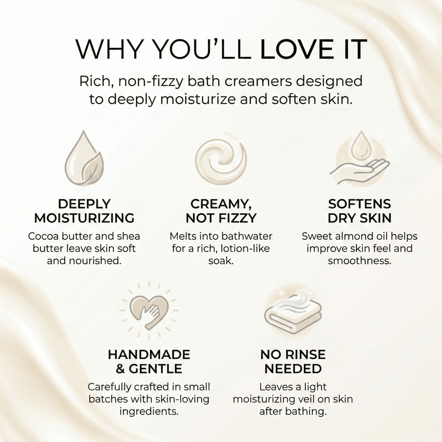 Skin-safe scent blended specifically for each creamer. Chosen to linger softly on the skin after the bath — not just in the water. Senteur sans danger mélangée spécifiquement pour chaque crème. Choisie pour persister doucement sur la peau après le bain — pas seulement dans l'eau.